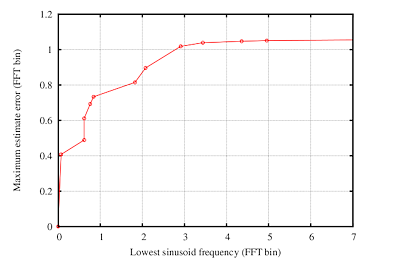 From our 2007 paper An Iterative Linearised Solution to the Sinusoidal Parameter Estimation Problem: "Region of convergence as a function of the sinusoid frequency. The algorithm never converges when the initial estimate is off by more than 1.05 DFT bins (2π/L rad/s)."