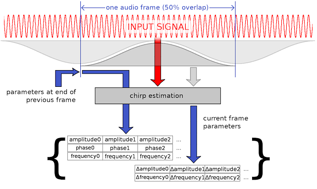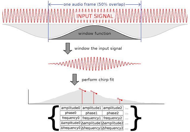 As the left edge of the chirp is fixed, the things that can change across the frame are the amplitude and instantaneous frequency. Thus, we've rendered three of our five parameters for the new frame's chirps implicit, leaving only the need to fit the amplitude and frequency modulation across the current frame.