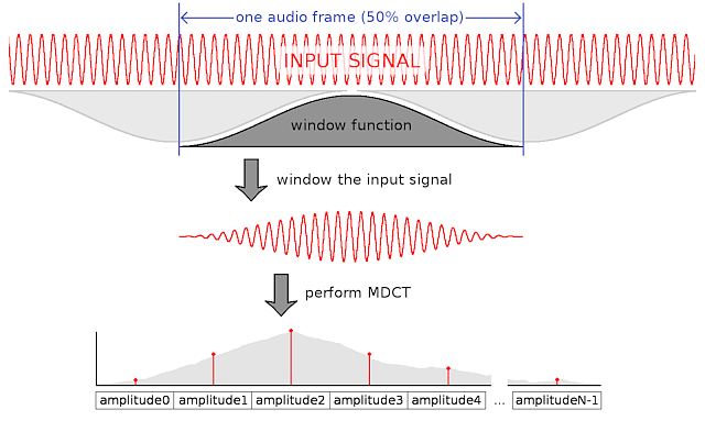 The FFT (Fast Fourier Transform) and similar related transforms that offer smooth overlapping blocks (such as the MDCT) are all transforms that map a time-domain signal into the frequency domain, that is, a summed series of a fixed set of sinusoids. These transforms are 'critically sampled', meaning that N time domain input samples yields N output sinusoidal amplitude values; the number of values in equals the number of values out. They are also (at least) bi-orthogonal; the process is lossless and can be reversed exactly.