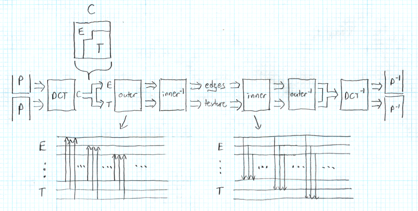 The lapped DCT produces a block of coefficients C that we divide into two groups, E (edges) and T (texture). The 'outer' filter is a series of lifts from T to E. The 'inner' filter is a series of lifts from E to T. 'outer' is trained to copy edge energy from T to E. 'inner' is trained to copy edge energy from E back to T. The inverses remove the edge energy from E and T respectively.